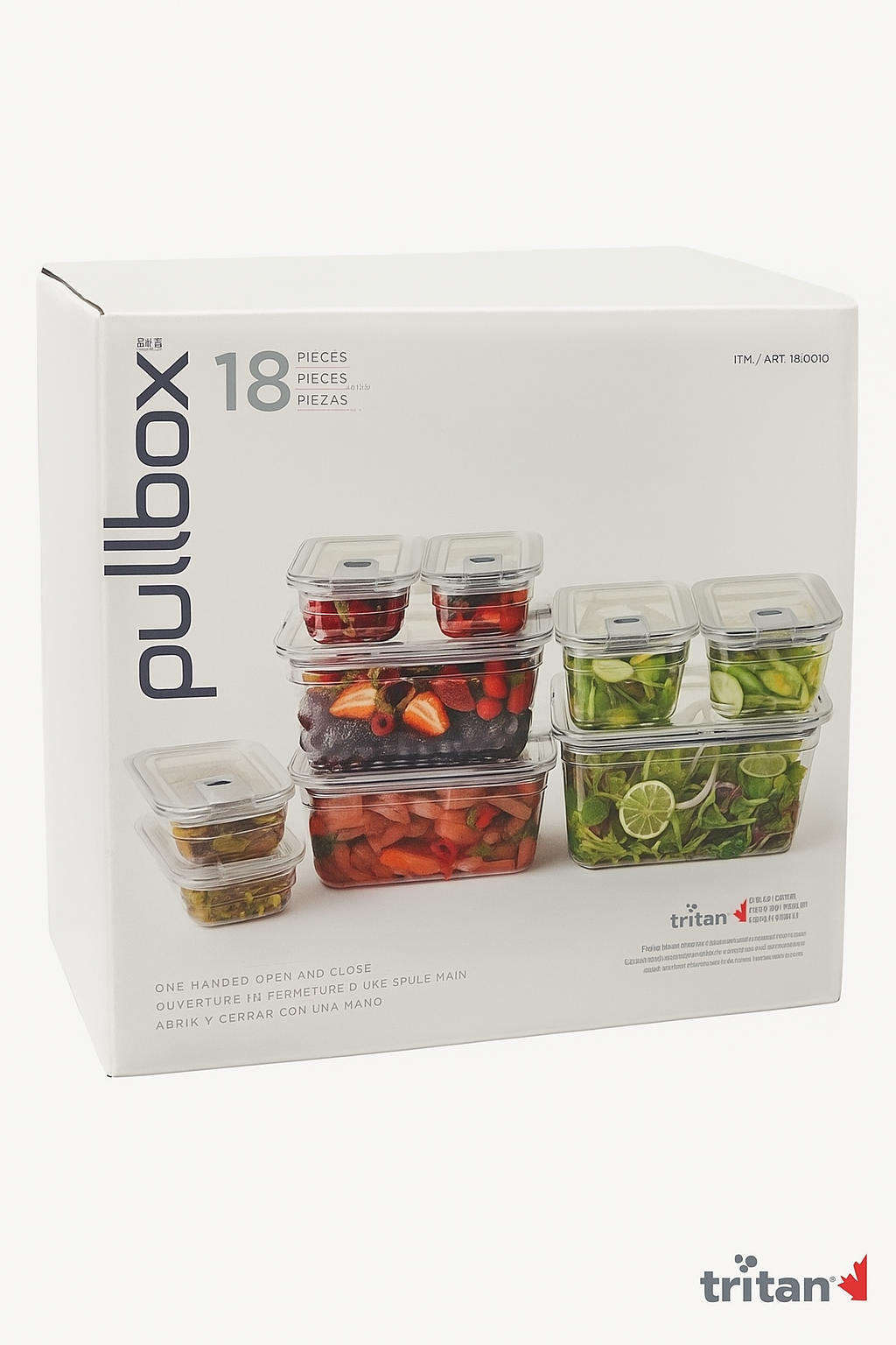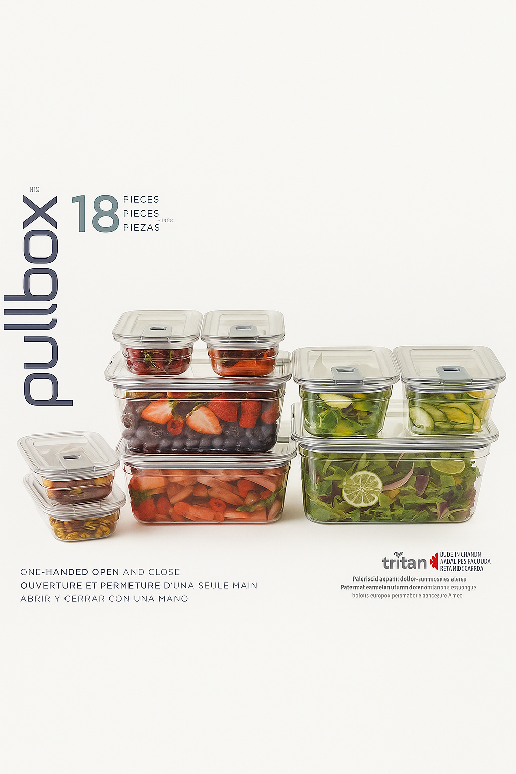 Pullbox 18-piece Tritan storage set designed for fresh food organization. Durable, clear, and easy to open with one hand—perfect for meal prep, snacks, and fridge storage. Ideal for home and on-the-go use.
