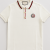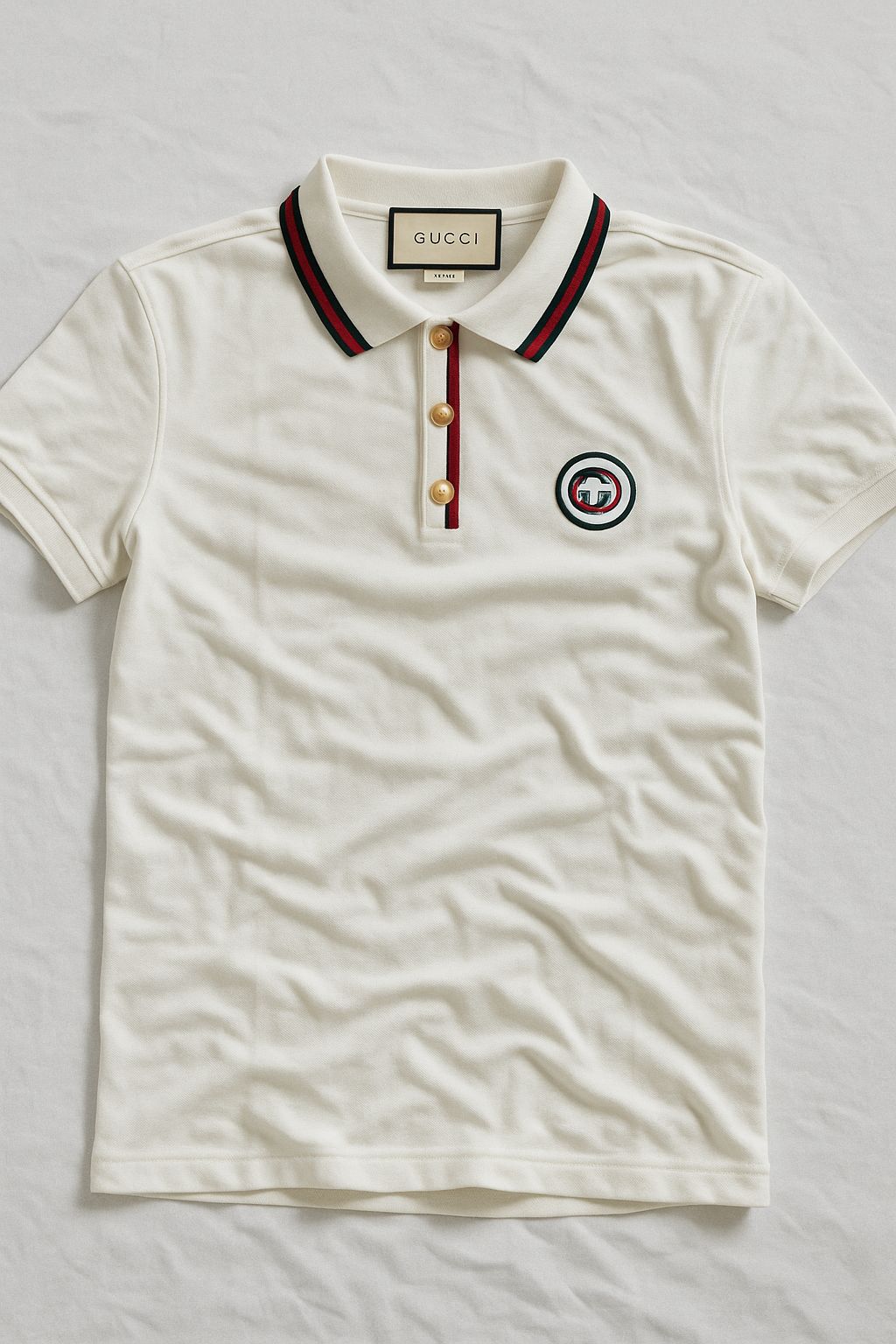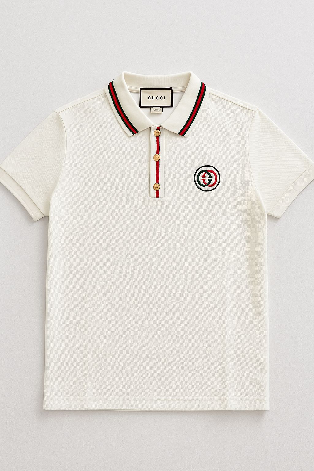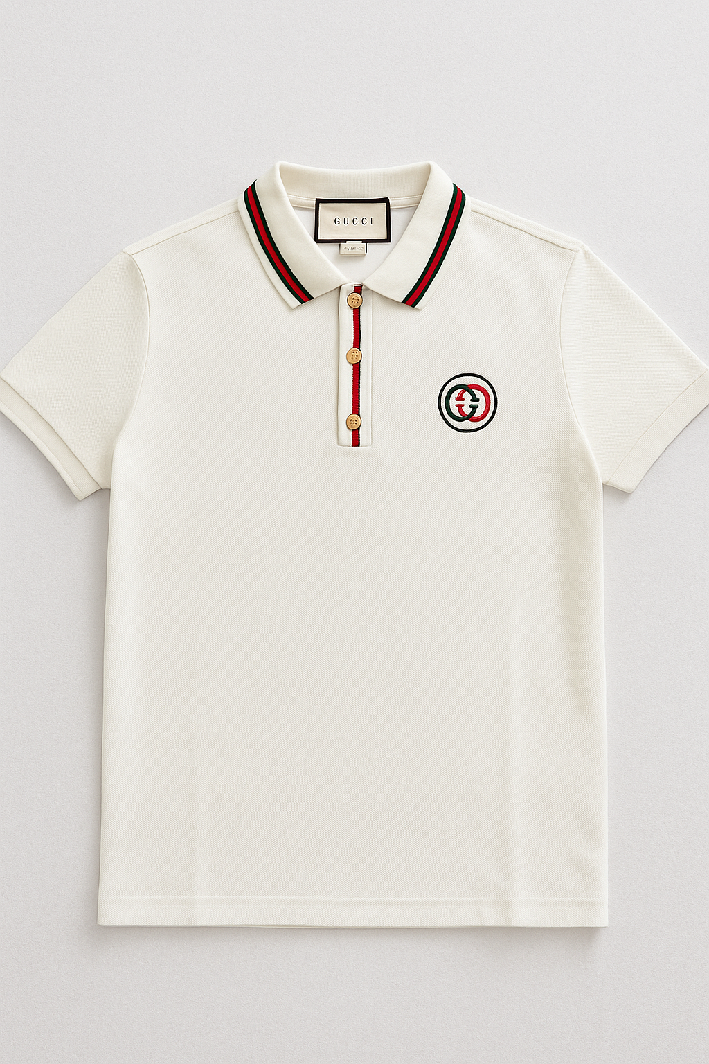 short-sleeve polo in white cotton piqué featuring a ribbed collar with green-red stripes, a matching striped placket with gold buttons, and an embroidered circular logo on the chest. clean, fitted, and suitable for casual or smart-casual wear.