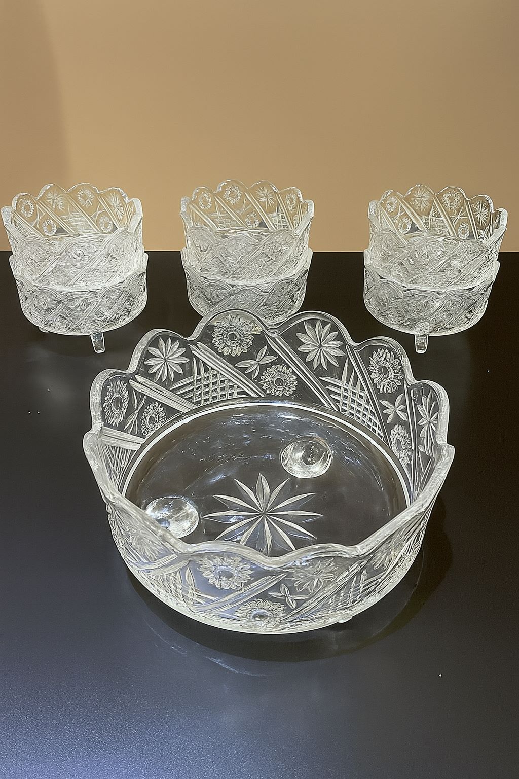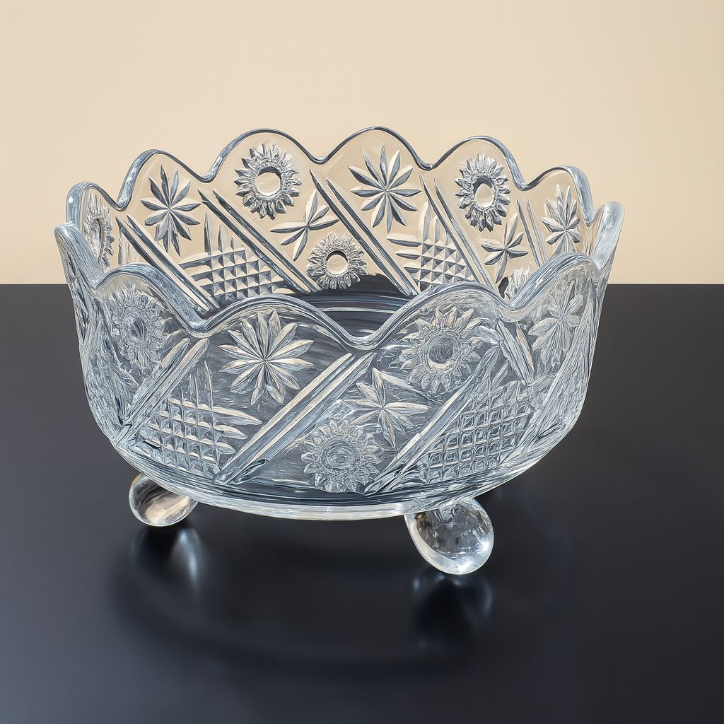 This luxurious crystal serving set includes a large decorative bowl and six matching smaller bowls. Each piece features intricate floral and geometric patterns in cut glass, with scalloped edges and rounded feet for added elegance. Perfect for special occasions or as an opulent display piece, this set adds timeless charm and sophistication to any table.