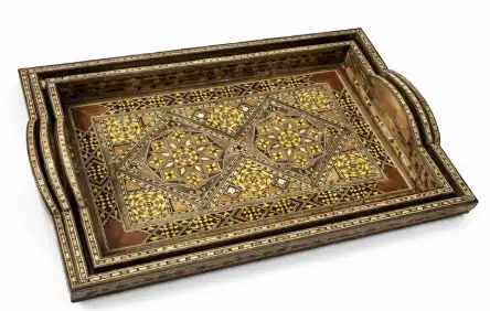 Sale!An exquisite set of 3 wooden serving trays featuring intricate geometric mosaic inlay. A perfect blend of traditional oriental artistry and modern hospitality.