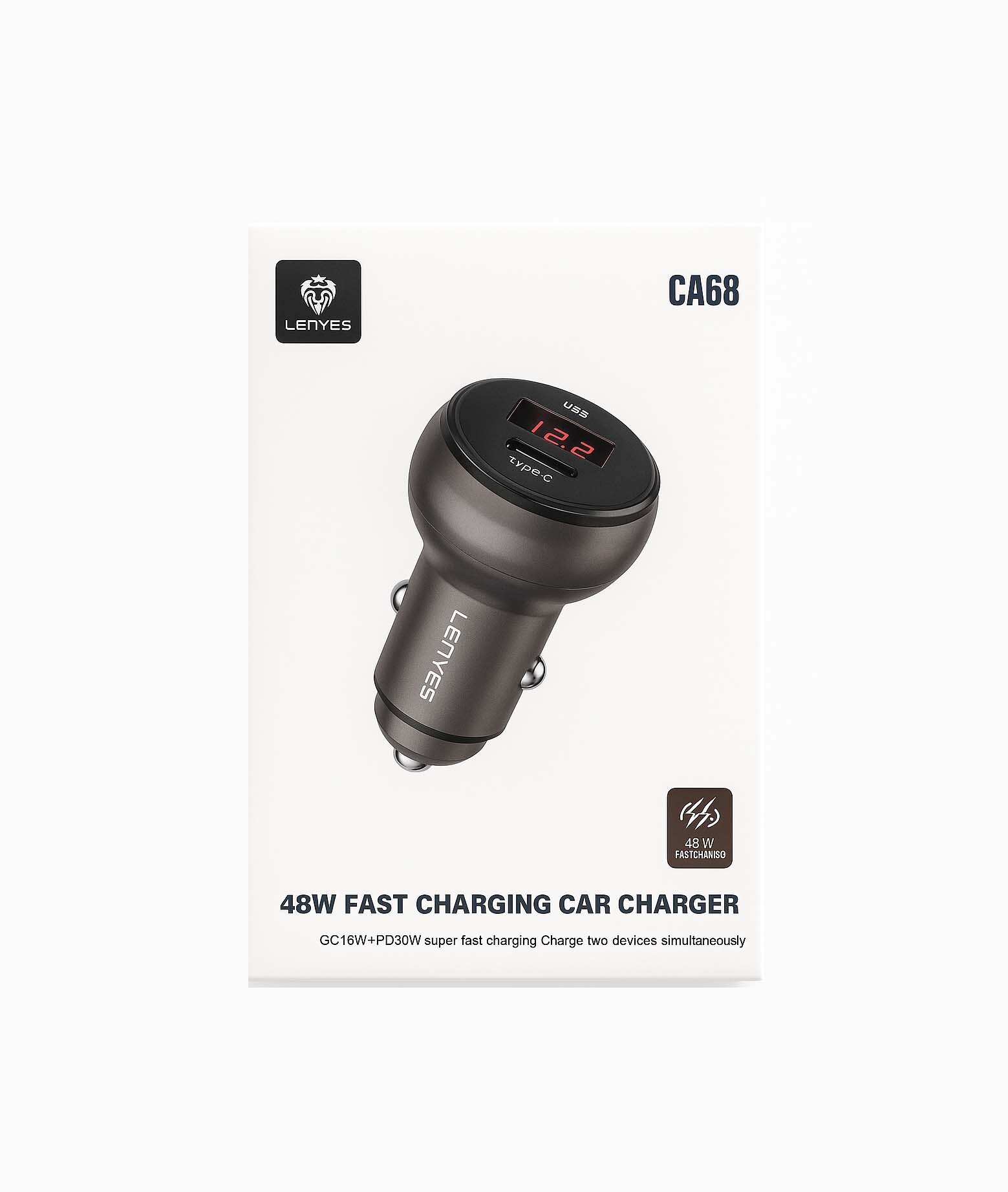 Lenyes CA68 48W Fast Car Charger with USB + Type-C ports, smart protection, and real-time voltage display.
