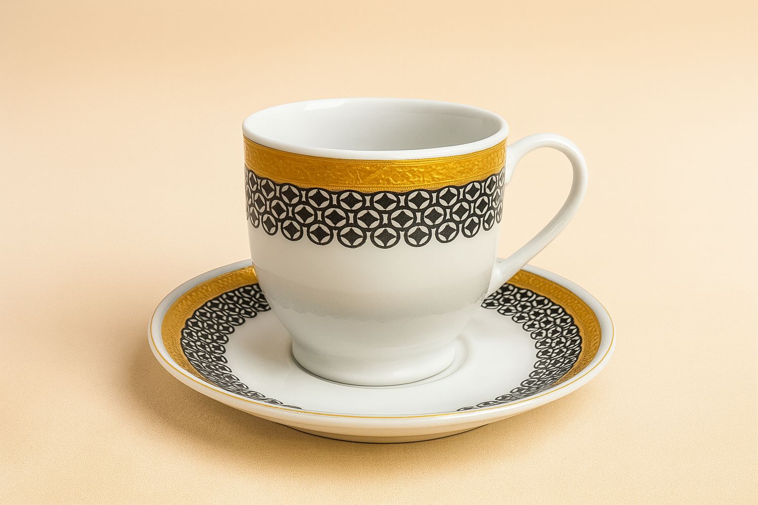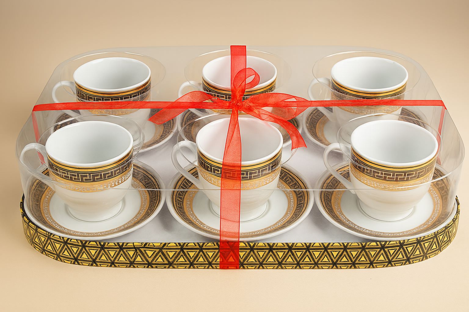 Elegant 12-piece porcelain coffee or Tea cup set featuring a refined gold rim and intricate black geometric design. Perfect for gifting or adding a touch of luxury to your coffee moments. Comes beautifully packed with a decorative red ribbon.