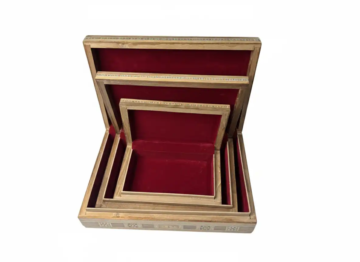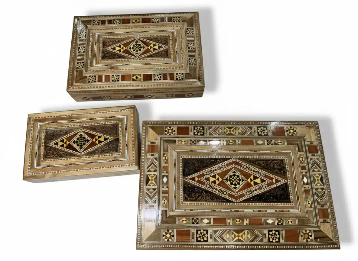 Sale!A regal set of 3 nesting wooden boxes featuring intricate handcrafted mosaic inlay and a luxurious red velvet lining. Perfect for organizing jewelry or adding a