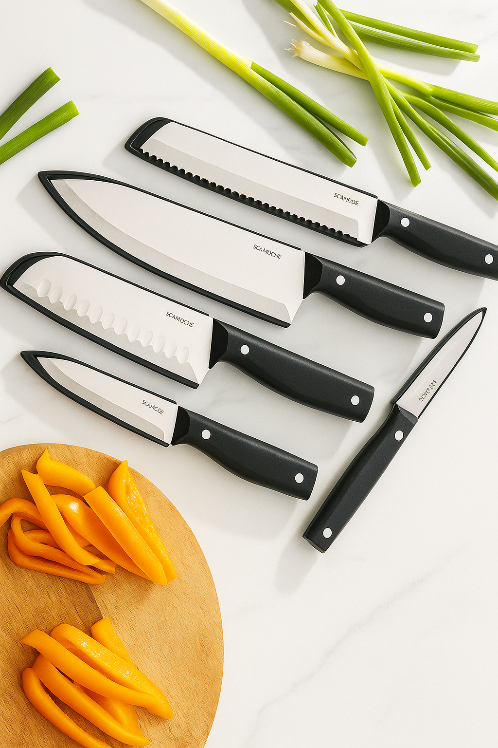 Crafted for performance and durability, this knife set is designed to handle all your kitchen cutting tasks with ease. Each knife features a full tang with riveted ABS handles for exceptional strength and balance. The high-quality German steel blades ensure long-lasting sharpness, while the hollow grind edges deliver precise, smooth cuts every time.