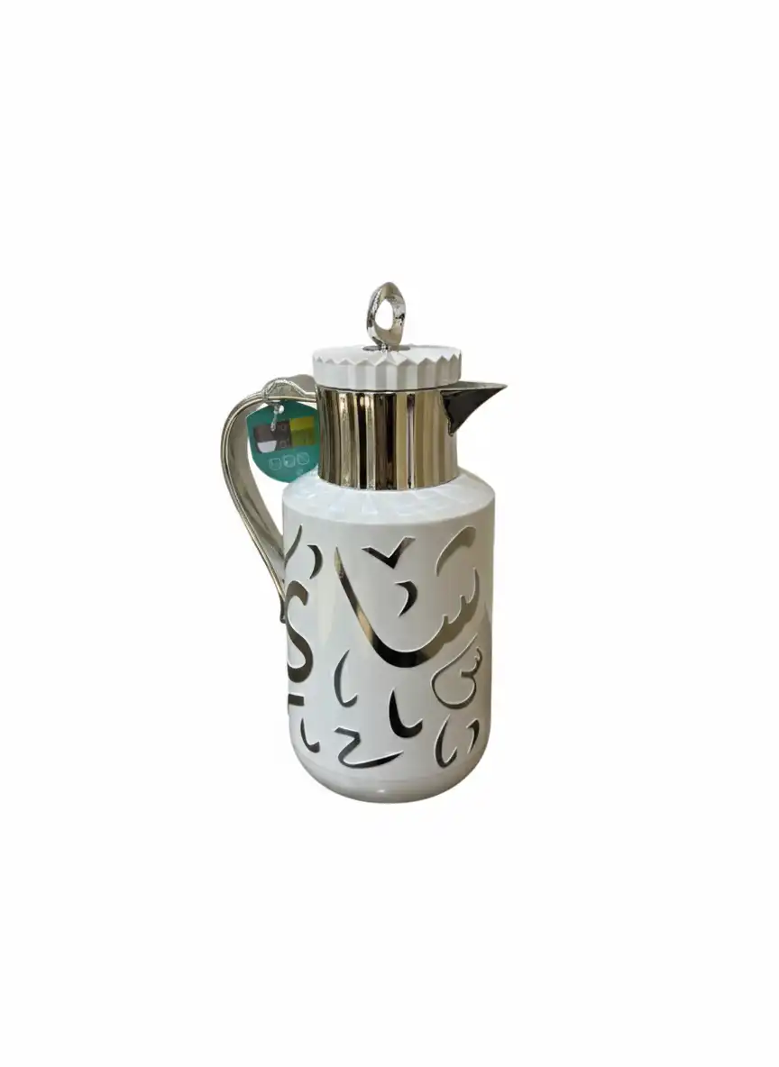 A high-quality 1L vacuum flask featuring a stylish Arabic calligraphy pattern and a polished metallic top. Built with strong insulation to maintain beverage temperature for long periods, making it ideal for serving coffee, tea, or daily gatherings. Durable, easy to pour, and available in both black and white designs for a modern, luxurious look on any table.